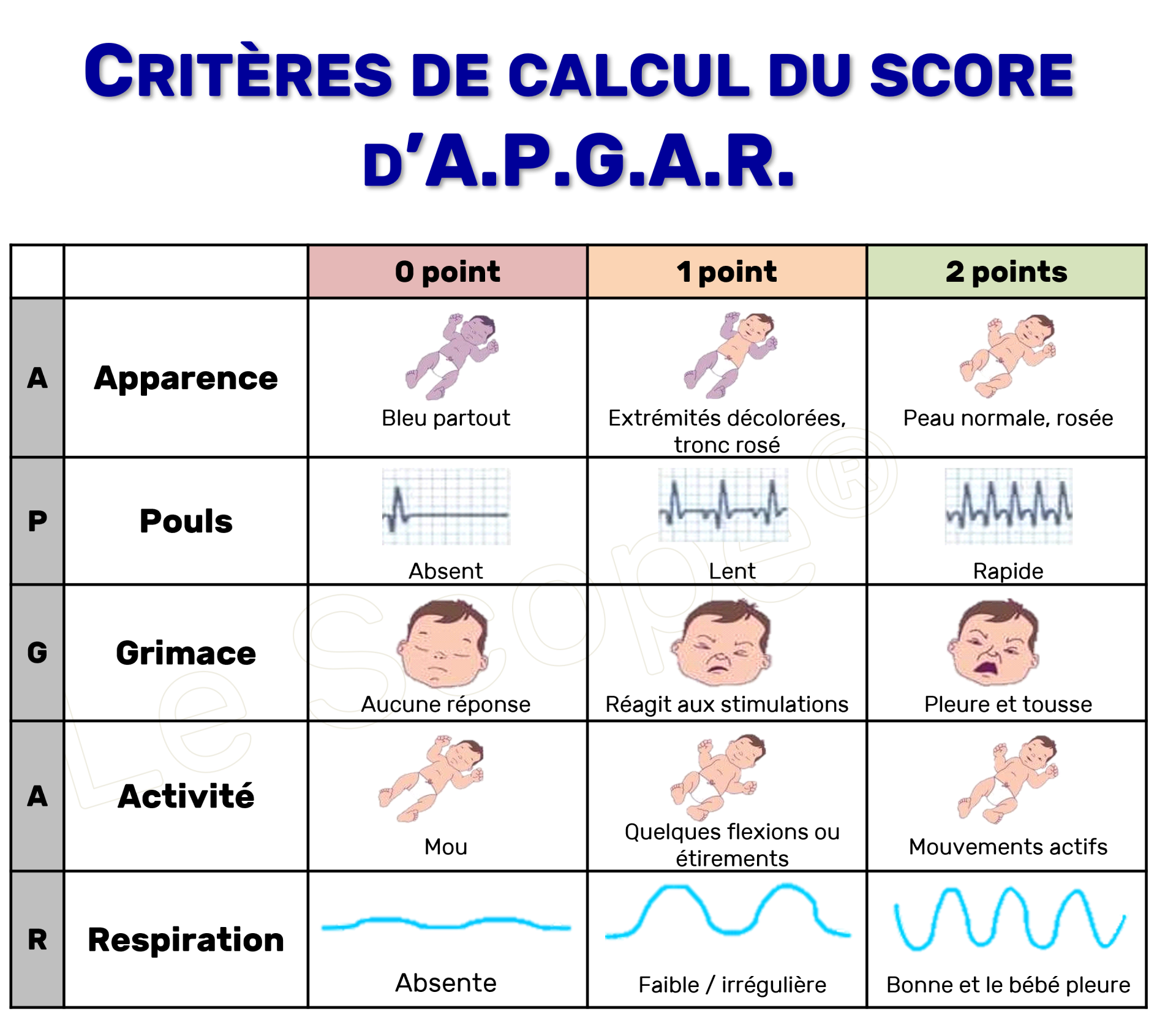 Une fois l’expulsion fœtale terminée, l’évaluation immédiate de l’état de santé du nouveau-né est essentielle afin de déterminer la nécessité de soins. Cette évaluation initiale peut être réalisée rapidement à l'aide du score d'APGAR, un outil de scoring clinique développé dans les années 1950 par Virginia Apgar, anesthésiste, pour évaluer la capacité d’adaptation du nouveau-né à la vie extra-utérine, notamment sur le plan respiratoire.